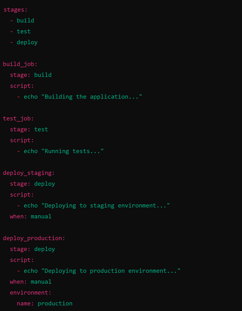 In this configuration, deploy_staging and deploy_production are manual jobs that need to be triggered by a user.